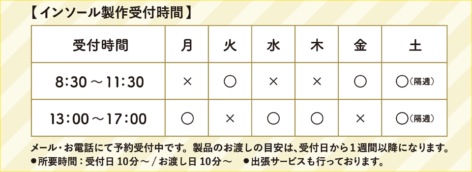 | 対象者 | 外反母趾、扁平足、変形性膝関節症、(O脚)、たこ・魚の目、疲れやすさや、痛みなどの気になる方 |